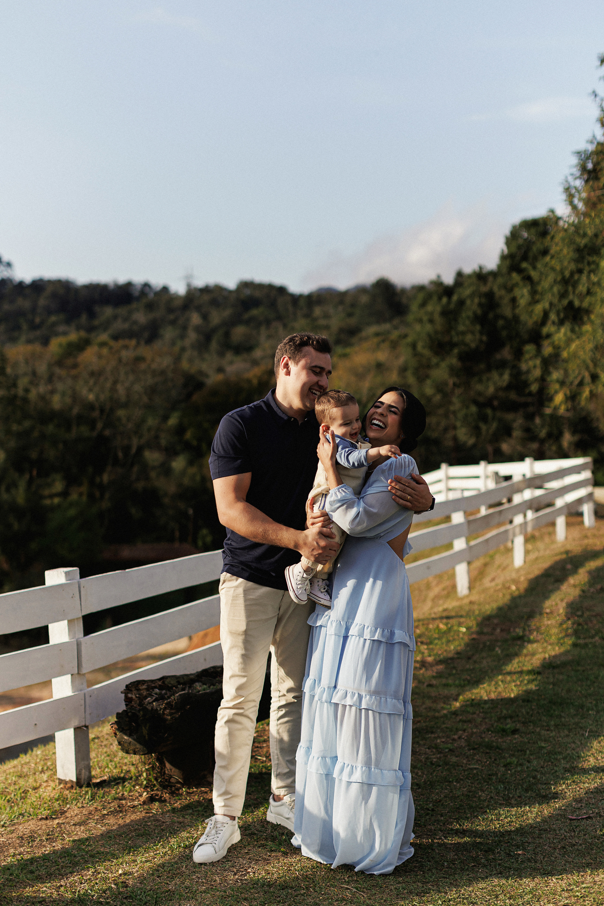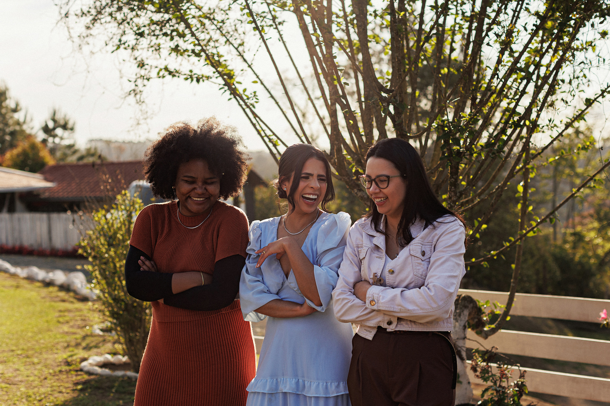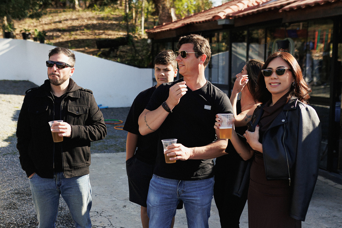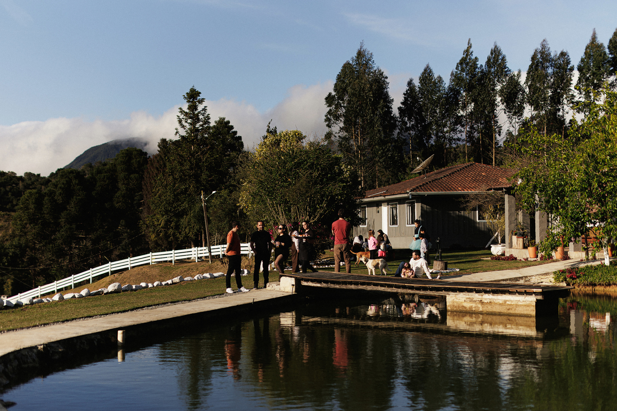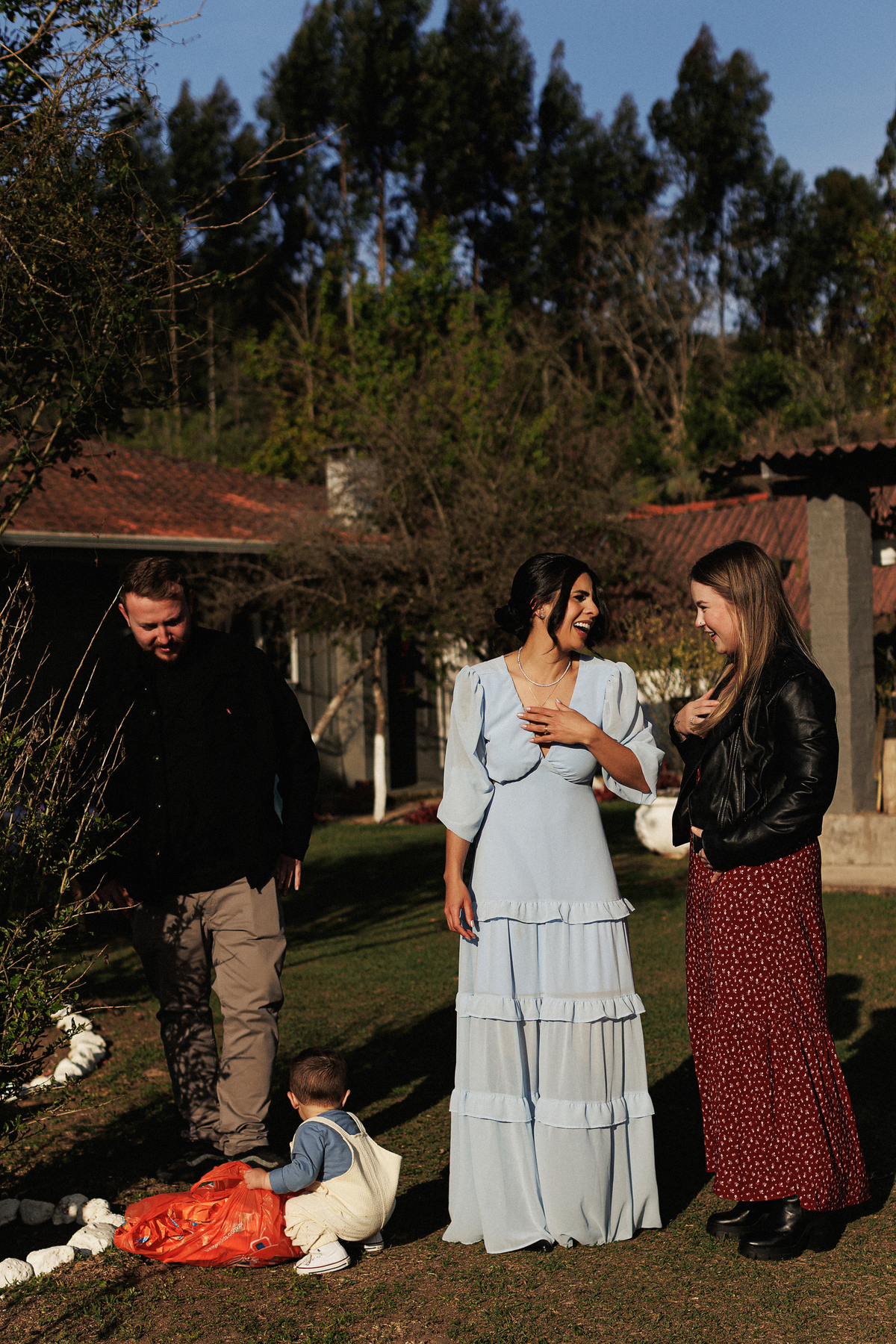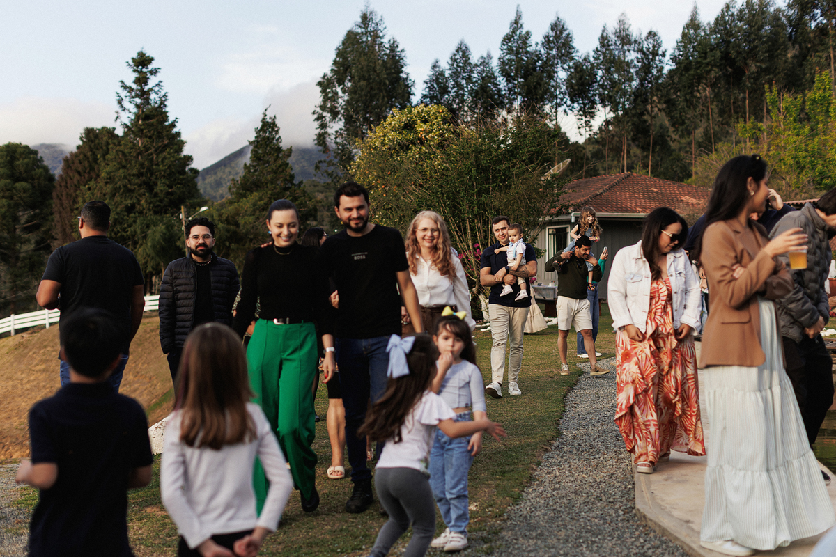 Dia de sol, no campo, familia e amigos reunidos.